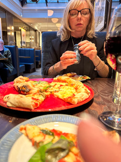 Night brought pizza and song! Elaine and Helen ate a margarita pizza (Barolo Grill) and danced and sang at the Horseshoe Bar, both in Glasgow's city center.